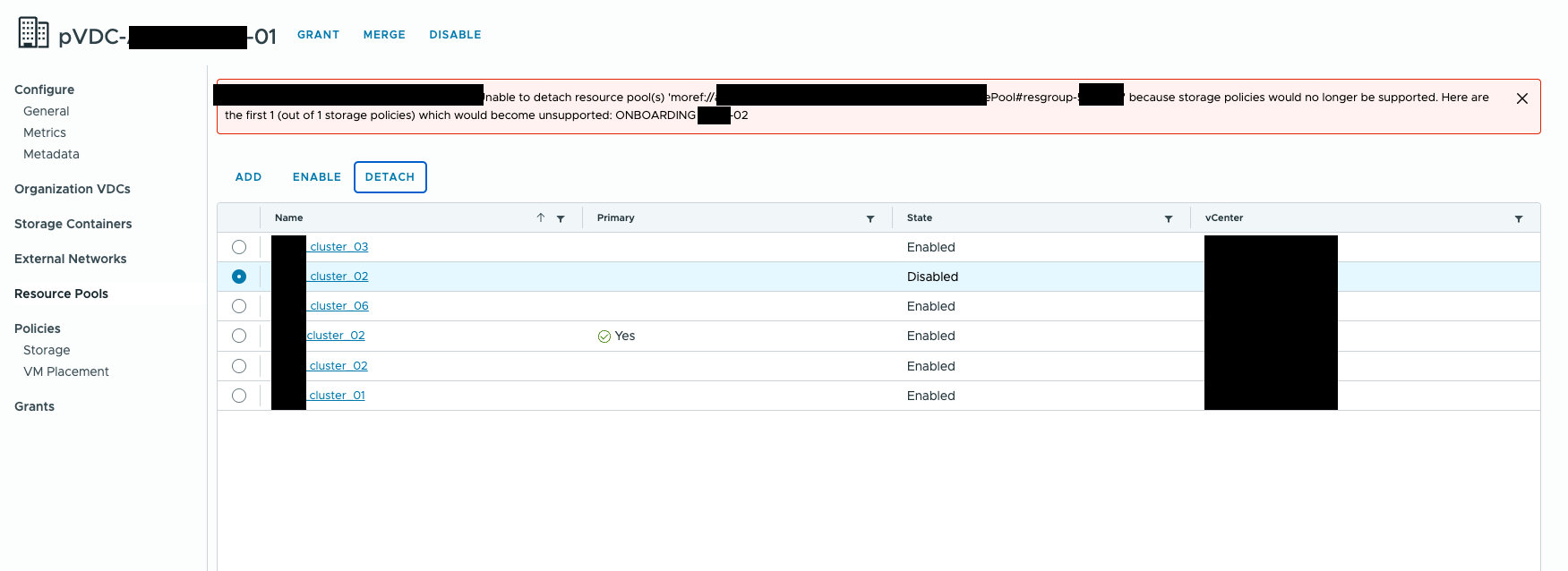 [ c5ee9dle-f426-426c-803c-xxxxxx ] Unable to detach resource pools) 'moref://xxxxxx-xxxxxx-xxxxxx-xxxxxx-xxxxxx/ResourcePool#resgroup-xxxxxx' because storage policies would no longer be supported. Here are the first 1 (out of 1 storage policies) which would become unsupported: ONBOARDING XXXX-02