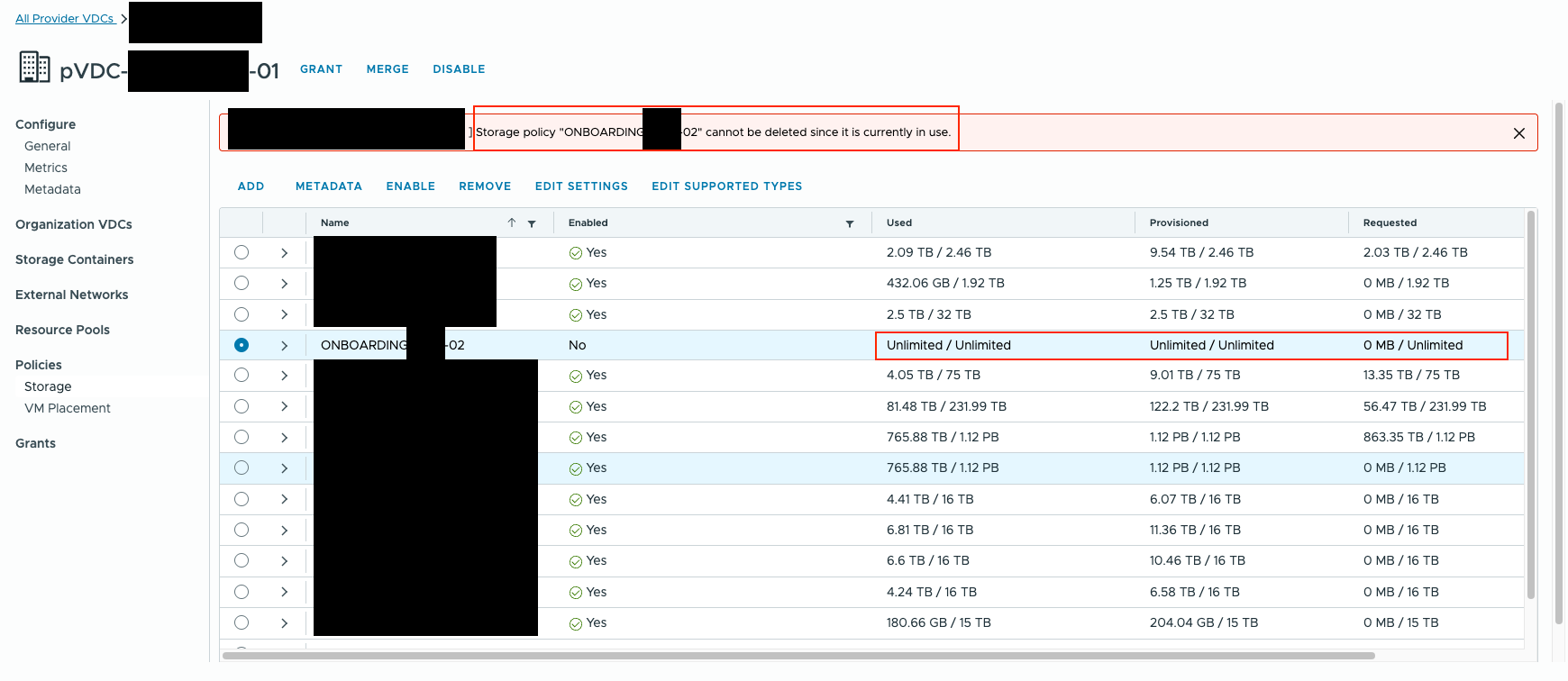 Storage policy "ONBOARDING-02" cannot be deleted since it is currently in use.