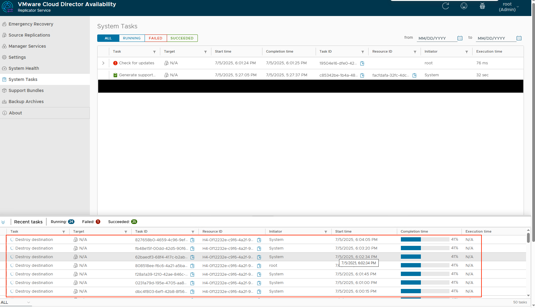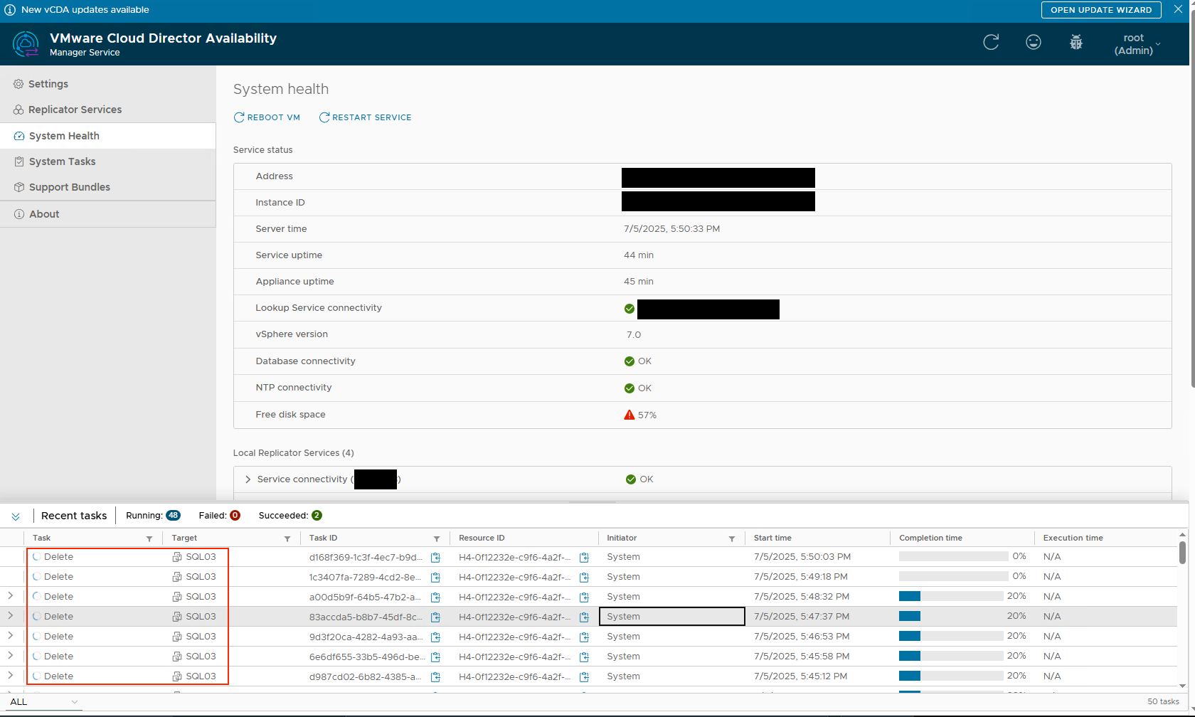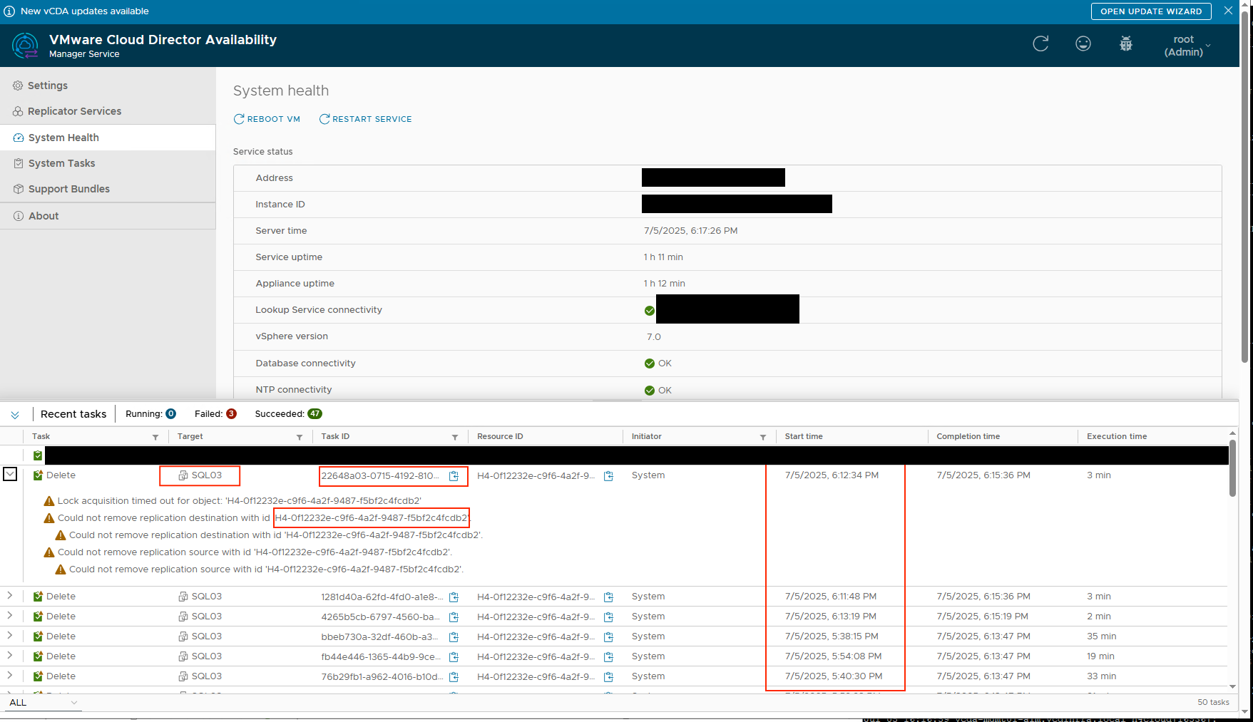 4739b6f7-1eb6-4fa6-810b-XXXXXXX | | | 2025-07-05 11:25:17.913 | ORG@Availability | | C4-5825c99e-d8d0-4b89-8a8f-XXXXXXXX | | DRaaS | 0 | SQL03